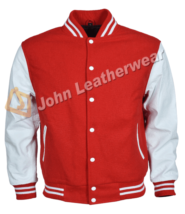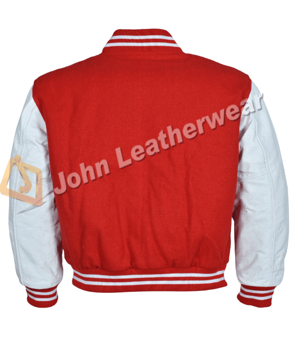 Classic Red and White Varsity Jacket featuring a timeless two-tone design,
